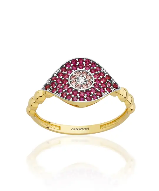 İkra Kuyumculuk koleksiyonuna ait bu Altın Göz Pembe Taşlı Yüzük, mistik göz figürünü pembe taşın yumuşak tonlarıyla 14 ayar altın kalitesinde buluşturuyor. 1.83 gram ağırlığındaki hafif ve narin yapısı, parmağınızda zarif bir duruş sergilerken gün boyu konforlu bir kullanım sunar.