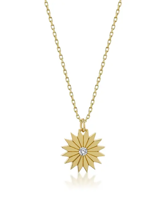 Güneş ışınlarını temsil eden keskin hatları ve altının sıcak parlaklığıyla tasarlanan bu kolye, stilinize her an ışık katacak sofistike bir aksesuardır.