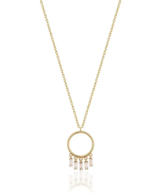 İkra Kuyumculuk koleksiyonuna ait bu Altın Halka Kolye, geometrik zarafeti ve ışıltılı detayları 14 ayar altın işçiliğiyle sunuyor. 2 gram ağırlığındaki estetik ve dengeli yapısı, altın halka formundan sarkan parıltılı taş detaylarıyla her hareketinizde boyun hattınızda dinamik bir ışıltı oluşturur.