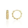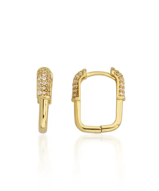 Bu altın kare taşlı küpe, zarif ve modern bir tasarıma sahiptir. Küpelerin kenarlarında yer alan taşlar, ışıldayarak şıklığınızı artırırken, altın rengi metal yapısı ile sofistike bir hava yaratır. Küpelerin kare formu, klasik yuvarlak halkalardan farklı olarak özgün bir stil sunar.