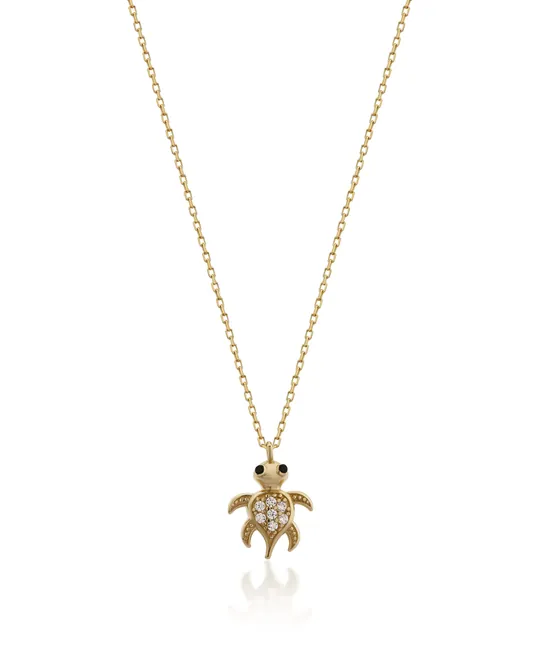 İkra Kuyumculuk koleksiyonuna ait bu Altın Kaplumbağa Kolye, uzun ömrü ve bilgeliği simgeleyen kaplumbağa figürünü 14 ayar altın ve minik, etkileyici bir tasarımla sunuyor. 1.55 gram ağırlığındaki hafif ve şık yapısı, figürün sempatik hatlarını altın parıltısıyla birleştirerek boyun hattınızda neşeli ve özgün bir duruş sergiler.