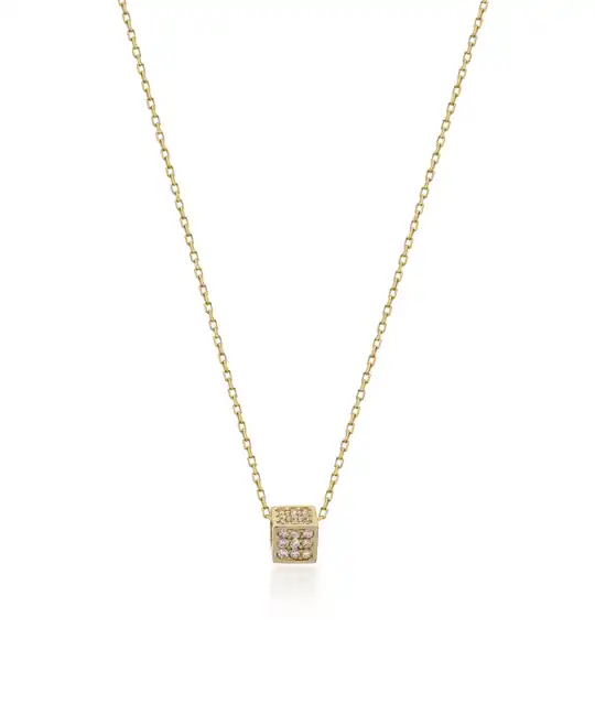 İkra Kuyumculuk koleksiyonuna ait bu Altın Küp Kolye, kübik formun modern geometrisini parıltılı taş detaylarıyla 14 ayar altın kalitesinde sunar. 1.51 gram ağırlığındaki narin yapısı ve 42-45 cm aralığındaki ayarlanabilir zincir uzunluğuyla boynunuzda seçkin bir duruş sergiler.