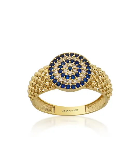 İkra Kuyumculuk koleksiyonuna ait bu Altın Nazar Boncuğu Taşlı Yüzük, geleneksel nazar boncuğu figürünü modern taş detaylarıyla birleştirerek 14 ayar altın kalitesinde sunar. 2.57 gram ağırlığındaki zarif tasarımı, parmağınızda estetik bir duruş sergilerken gün boyu konforlu kullanım sağlar.