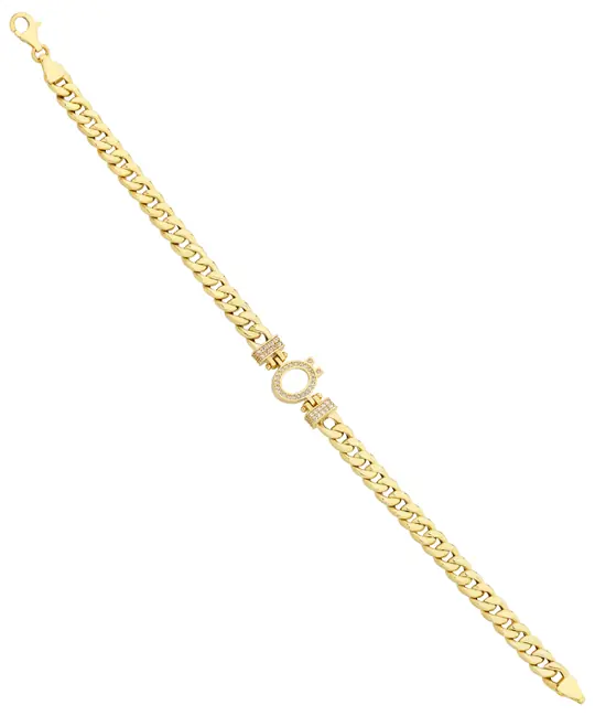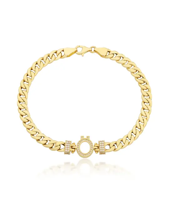Taş detaylı “Ö” harfiyle tasarlanmış, 14 ayar altın modern ve zarif bileklik. Günlük ve özel stilinizi öne çıkaran şık bir aksesuar.