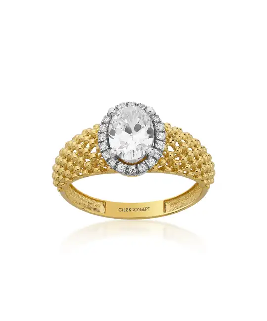 İkra Kuyumculuk koleksiyonuna ait bu Altın Oval Taşlı Yüzük, oval kesim taşın klasik zarafetini 14 ayar altın kalitesiyle sunar. 2.72 gram ağırlığındaki dengeli tasarımı, parmağınızda hem sofistike hem de estetik bir duruş sergilerken gün boyu konforlu kullanım sağlar.
