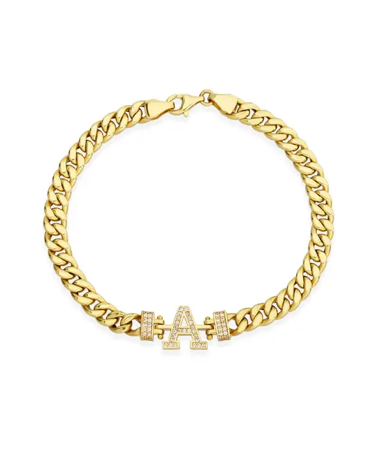 Taş detaylı büyük “R” harfiyle tasarlanmış, 14 ayar altından üretilmiş zarif ve modern bileklik. Kişisel dokunuş arayanlar için ideal bir aksesuar.