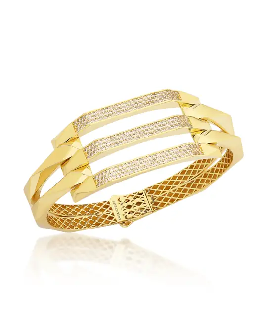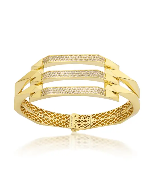 İkra Kuyumculuk koleksiyonuna ait bu Altın Taşlı Bilezik, ışıltılı detayları 14 ayar altın kalitesiyle birleştirir. 22.53 gram ağırlığındaki oldukça tok ve hacimli yapısı, bileğinizde prestijli ve göz alıcı bir duruş sergiler.