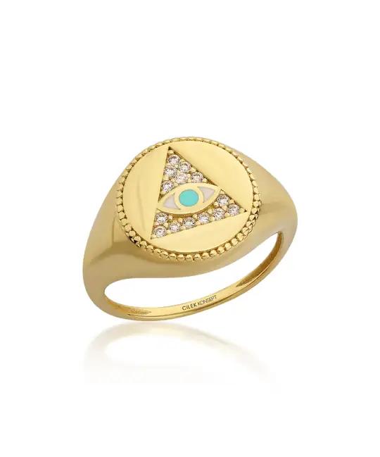 İkra Kuyumculuk koleksiyonuna ait bu Altın Taşlı Göz Yüzük, mistik göz figürünü modern taş işçiliğiyle birleştirerek 14 ayar altın kalitesinde sunar. 3.67 gram ağırlığındaki tok ve belirgin yapısı, parmağınızda güçlü bir estetik duruş sergilerken gün boyu konforlu kullanım sağlar.