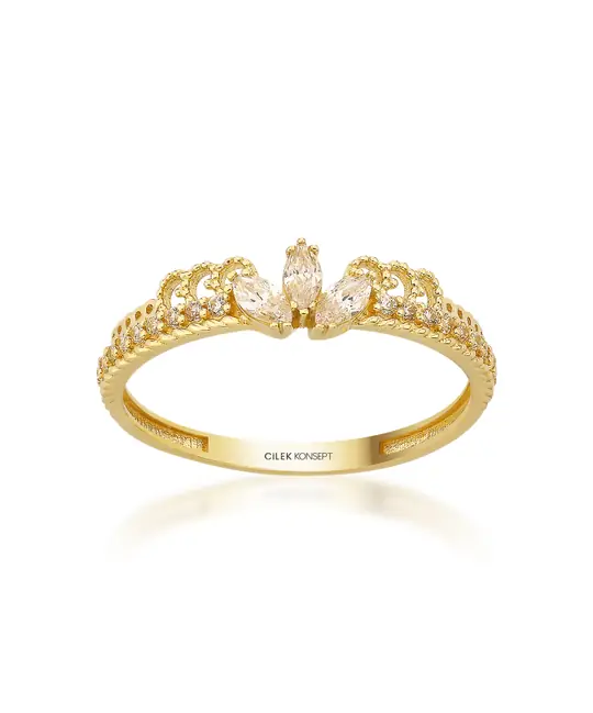 İkra Kuyumculuk koleksiyonuna ait bu Altın Taşlı Taçlı Yüzük, taç figürünün asaletini taşların ışıltısı ve 14 ayar altın kalitesiyle birleştirir. 1.5 gram ağırlığındaki zarif ve dengeli yapısı, parmağınızda şık bir duruş sergilerken gün boyu konforlu bir kullanım sunar.