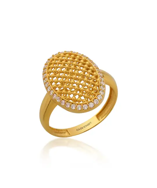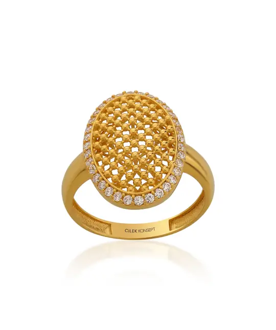 Altın Taşlı Toplu Yüzük, üzerinde yer alan taşlı top detaylarıyla öne çıkan bir altın yüzük modelidir. Toplu taş dizilimi yüzüğün ön yüzeyinde dengeli bir alan oluşturacak şekilde konumlandırılmıştır ve yüzüğün formunu belirginleştirir.