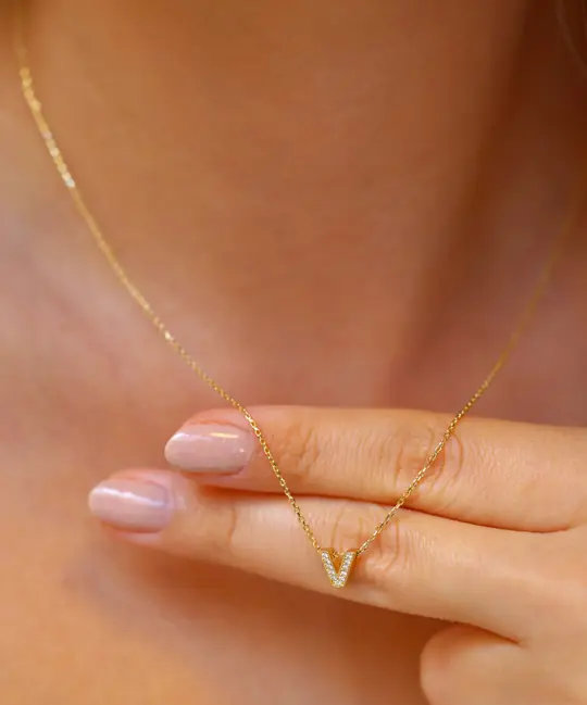 Işıltılı detaylarıyla dikkat çeken taşlı “V” harfi kolye, zarif ve anlamlı tasarımları sevenler için mükemmel bir tercihtir. Parlak taşlarla süslenen harf formu, altının sıcak ışıltısıyla birleşerek tasarıma sofistike bir dokunuş katar. Kişisel anlam taşıyan bu özel kolye, anılarınızı stilinize yansıtmanın en zarif yollarından biridir.Gün boyu göz alıcı duruşunu koruyan tasarım, zamansız şıklığın sade ama etkileyici bir ifadesidir. Minimalist yapısıyla her stile uyum sağlayan bu kolye, her bakışta zarafetini ortaya koyar.