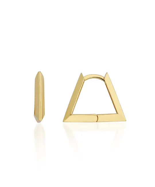 Bu altın küpe seti, modern ve minimalist tasarımıyla dikkat çeker. Üçgen şekilli tasarımı, zamansız ve şık bir görünüm sunar. Parlak altın yüzeyi, sade geometrik hatlarla birleşerek zarif bir dokunuş yaratır.