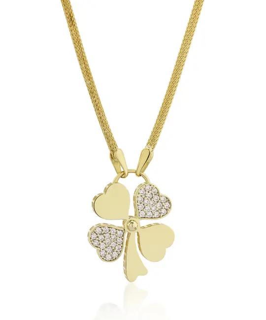 Parıltılı taş detaylarıyla zenginleştirilen yonca motifi, altının doğal ışıltısını modern bir işçilikle birleştirerek özel anlarınız için şık ve anlamlı bir aksesuar seçeneği oluşturur.