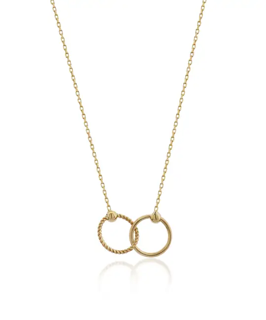 İkra Kuyumculuk koleksiyonuna ait bu Altın Zincirli Kolye, birbirine kenetli iki halka figürüyle sadakati ve zarafeti 14 ayar altın kalitesiyle boynunuza taşıyor. 1.5 gram ağırlığındaki hafif ve modern yapısı; düz ve burgu desenli halkaların kontrastıyla zenginleşerek her tarzla uyum sağlayan sofistike bir görünüm sunar.