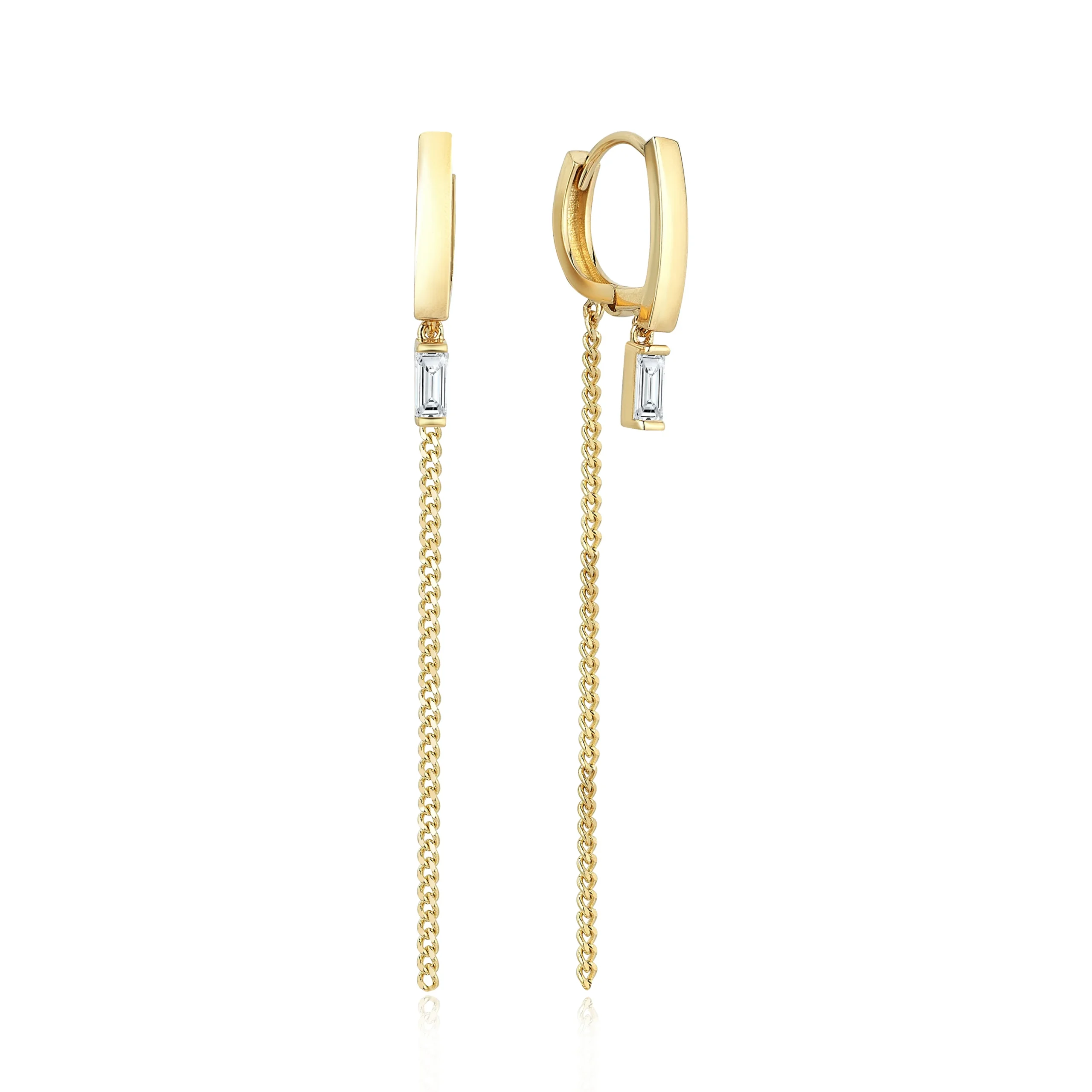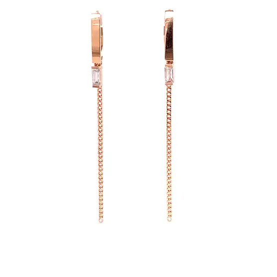 Bagetto Baget Zincir Sallantılı Altın Küpe, 14 ayar altından zarafetle üretilmiş modern ve şık bir aksesuardır. Baget taş detayları ve ince zincir sallantısı ile zarif bir ışıltı sunar. Günlük kullanımda veya özel davetlerde rahatlıkla kombinlenebilir. Tek olarak ya da çift şekilde tercih edilebilir. Sarı, Rose ve Beyaz altın renk seçenekleriyle her tarza uyum sağlar.