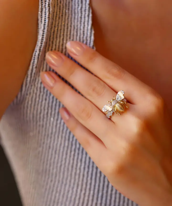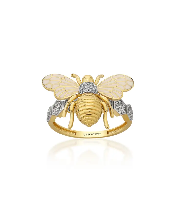 İkra Kuyumculuk kalitesiyle 14 ayar altından özenle üretilen bu Bee Mine Altın Arı Yüzük, çalışkanlığı ve zarafeti parmağınıza taşıyor. “Bee Mine” (Benim Ol) temasıyla tasarlanan bu yüzük, detaylı işçiliğe sahip zarif bir Arı figürüne sahiptir. Şık ve sade tasarımı, altının doğal ışıltısını ön plana çıkarır.