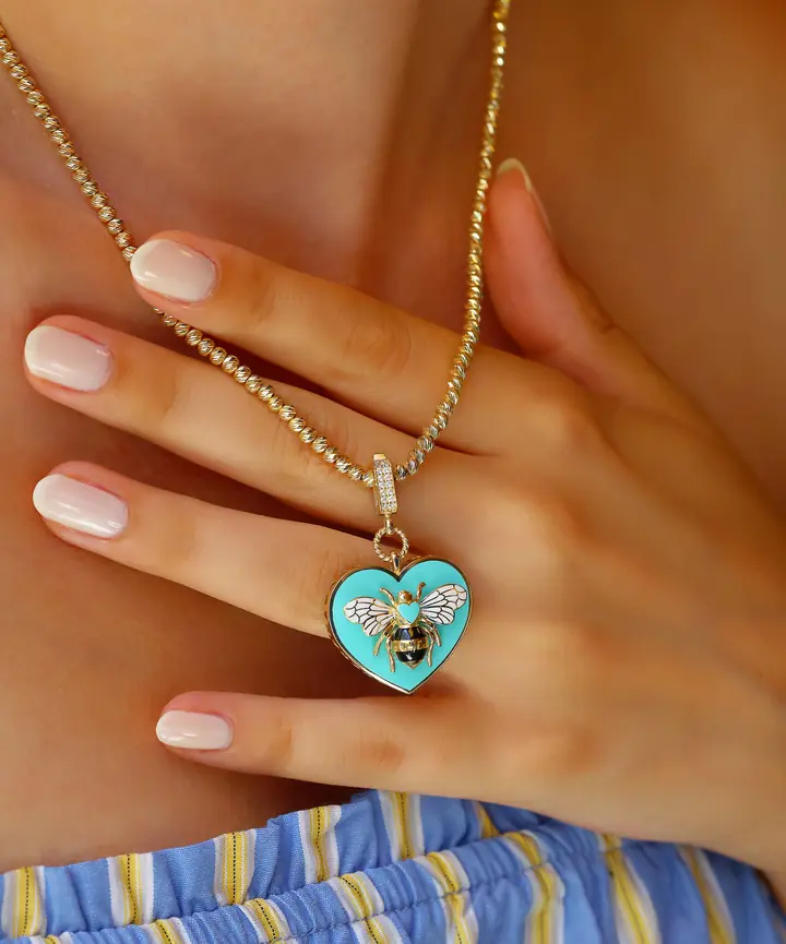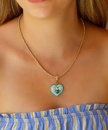 İkra Kuyumculuk kalitesiyle 14 ayar altından özenle üretilen bu Bee Mine Altın Turkuaz Kalp Kolye Ucu, romantizmi ve zarafeti canlı turkuaz detaylarla buluşturuyor. “Bee Mine” (Benim Ol) koleksiyonunun bu özel parçası, belirgin ve zarif bir Kalp motifine sahiptir. Kalbin üzerinde veya çevresinde kullanılan canlı turkuaz mine veya turkuaz taşlar, tasarıma ferah ve dikkat çekici bir ışıltı katmaktadır.