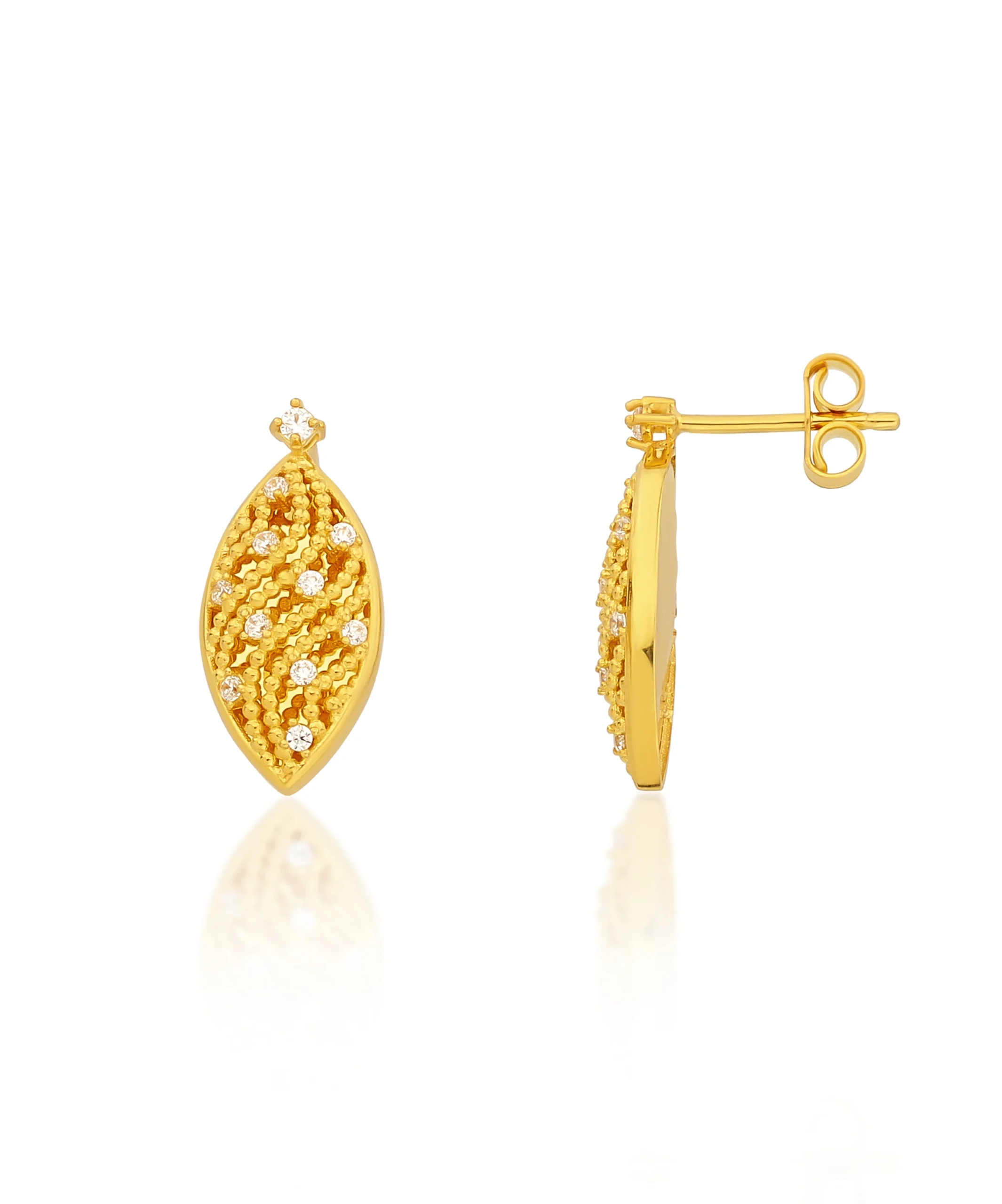 Bereket temasının kendine özgü işçiliği, küpenin yüzeyine dengeli bir görünüm kazandırır ve koleksiyonun diğer parçalarıyla estetik bir birlik ortaya koyar.