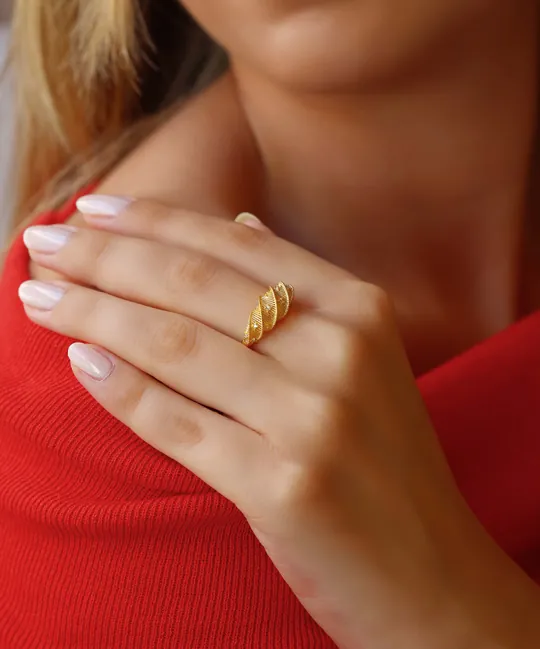 Bereket koleksiyonunun minimal ve dengeli tasarım anlayışını yansıtan bu yüzük, günlük kullanım ve özel kombinler için uygundur. 14 ayar altın yapısı, dayanıklılık ve uzun ömürlü kullanım sağlar. Koleksiyonun küpe, bileklik ve kolye ucu modelleriyle uyumlu tasarımı, 2.3 gram ağırlığıyla elde konforlu bir kullanım sunar ve Bereket temasının karakteristik detaylarını tamamlar.
