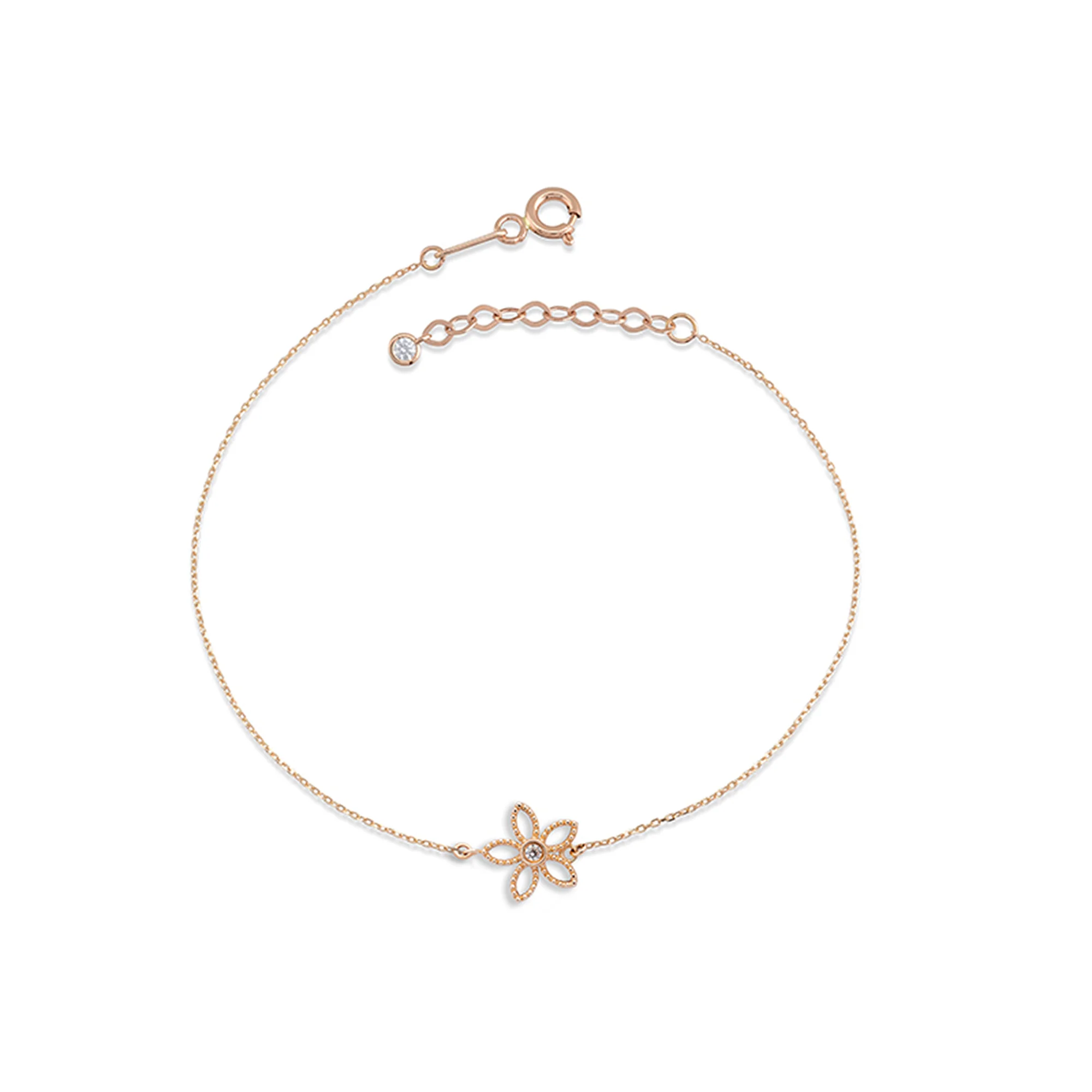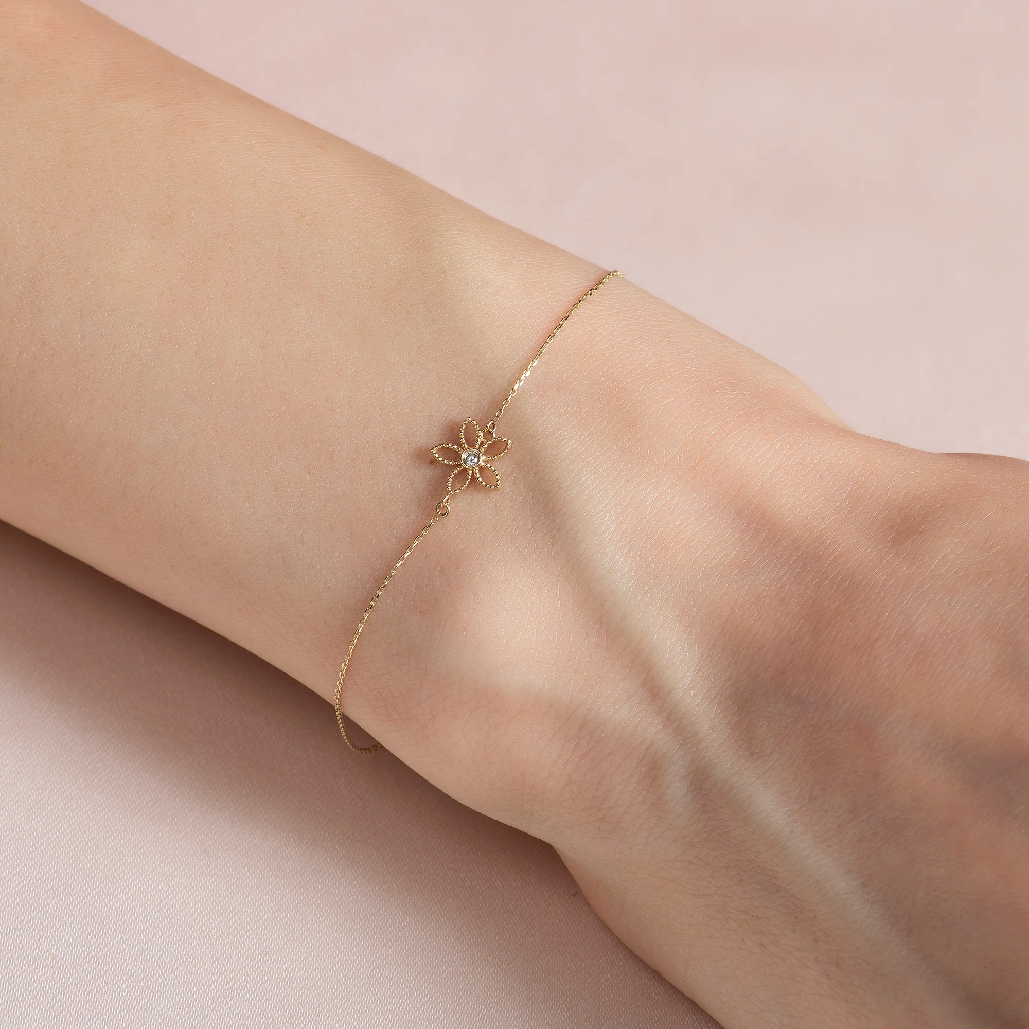 14 ayar altının sıcak tonlarıyla tasarlanan Cabaret Çiçek Form Taşlı Altın Bileklik, zarif çiçek formu ve 5A zirkon taşların ışıltısıyla romantik ve şık bir takıdır. Yaklaşık 1,00 gram ağırlığındaki bu bileklik, bileğe feminen bir zarafet kazandırır. 16,5 cm + 2 cm uzatmalı zincir detayı ile konforlu kullanım sunar. Günlük kullanımda olduğu kadar özel günlerde de zarifliğini ön plana çıkarır. Sarı, rose ve beyaz altın renk seçenekleriyle üretilmektedir.