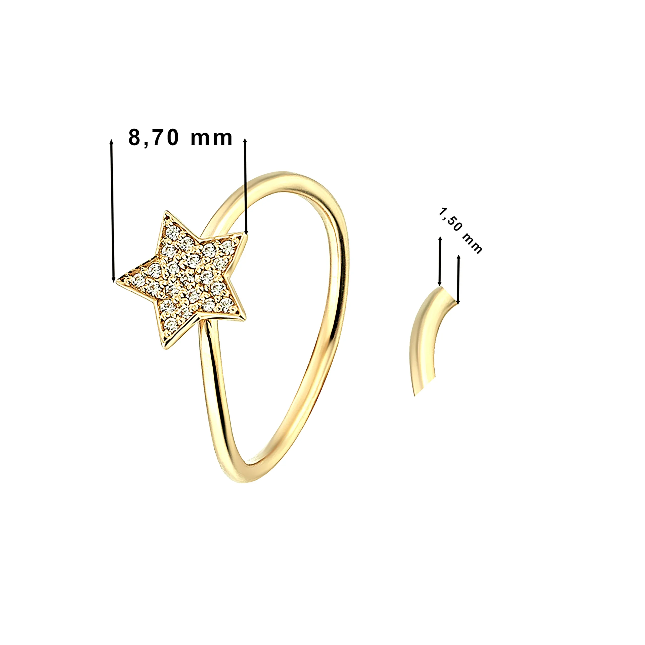 14 ayar Cabaret Yıldız Altın Yüzük, 1,50 gr ağırlığı ve 5A Zirkon detayı ile zarif ve şık bir kullanım sunar. Hipoalerjenik ve güvenli üretim.