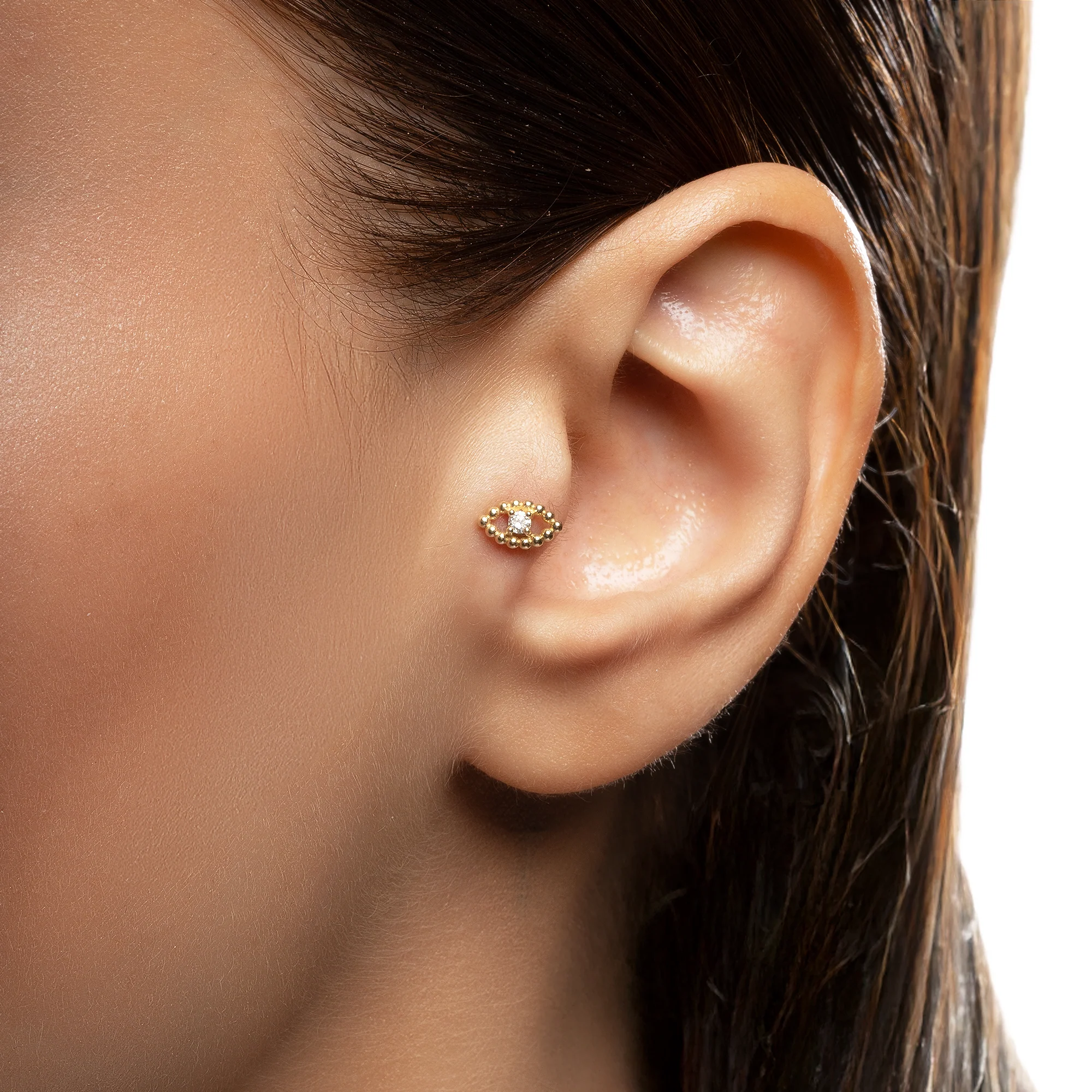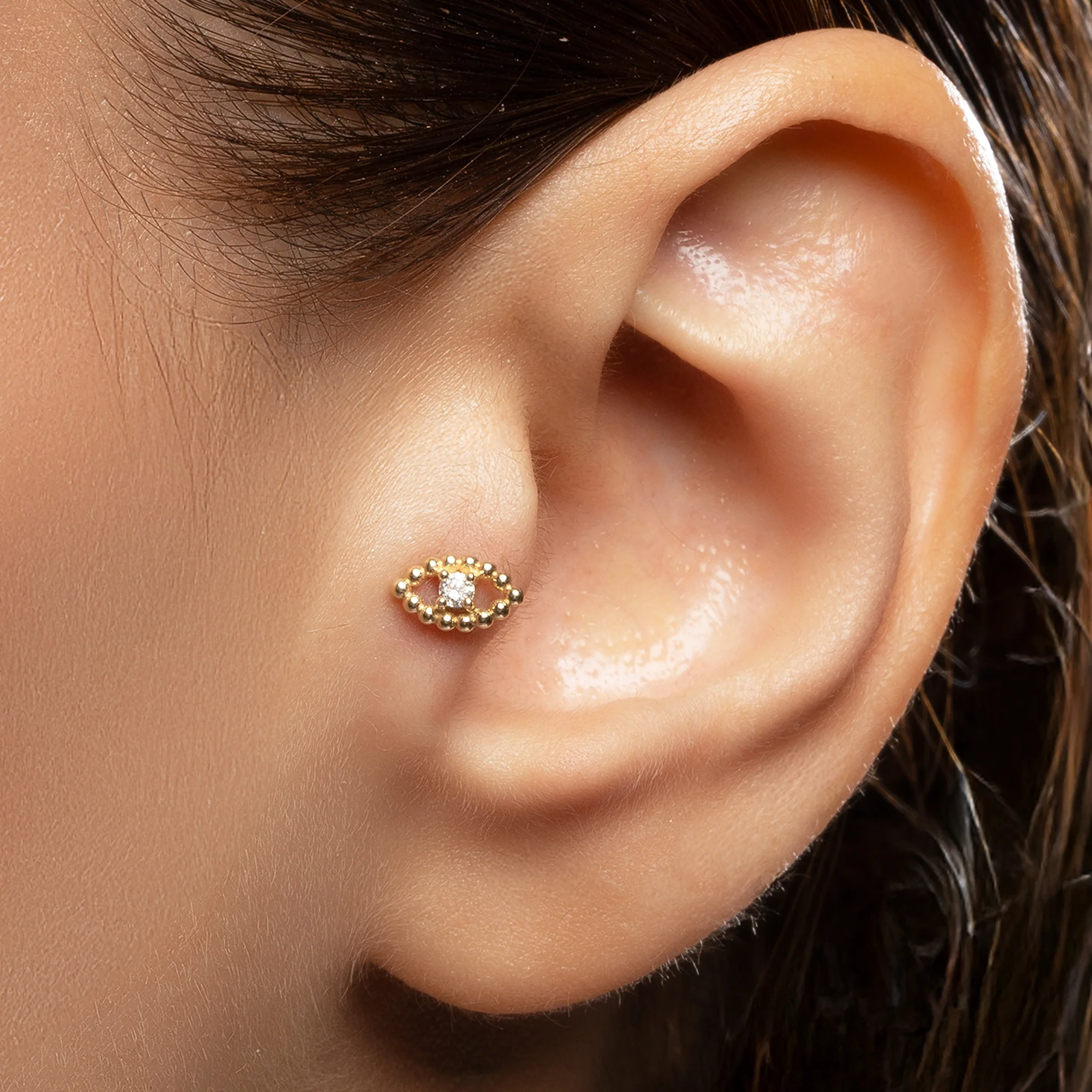 14 ayar Eye Göz Pırlanta Piercing, 0,03 CT pırlanta detayı ile zarif ve şık bir kullanım sunar. Hipoalerjenik ve güvenli üretim.