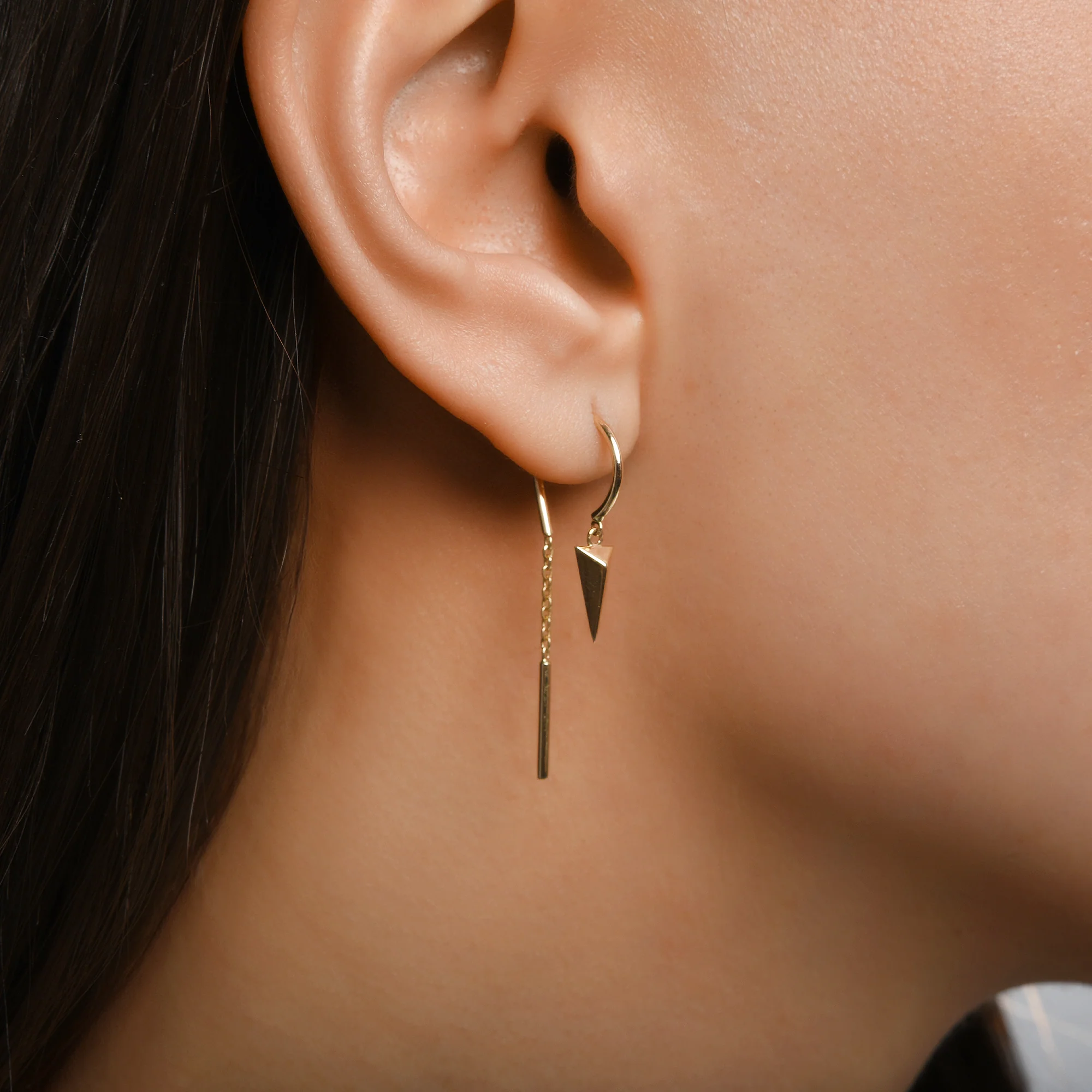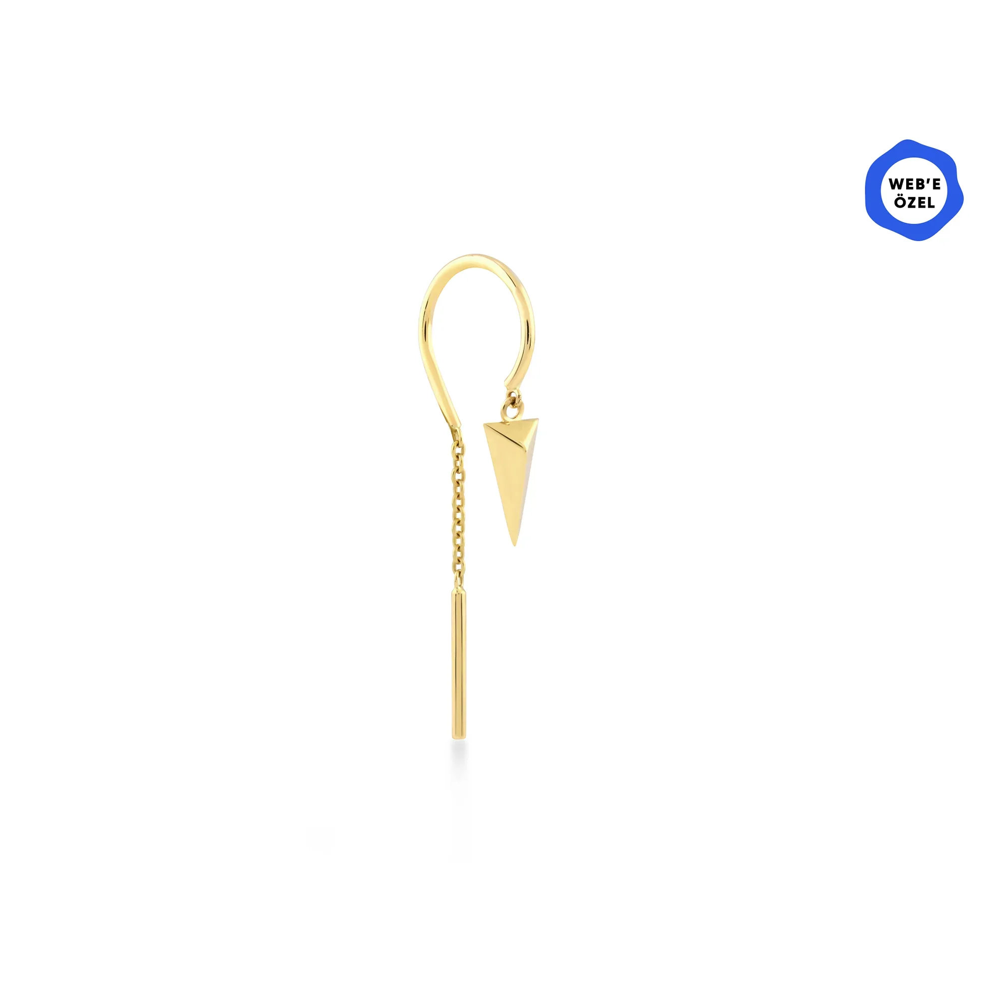 14 ayar altından üretilen Havana Asimetrik Zincir Sallantılı Üçgen Tek Altın Küpe, asimetrik formu ve zarif zincir detaylarıyla modern bir şıklık sunar.