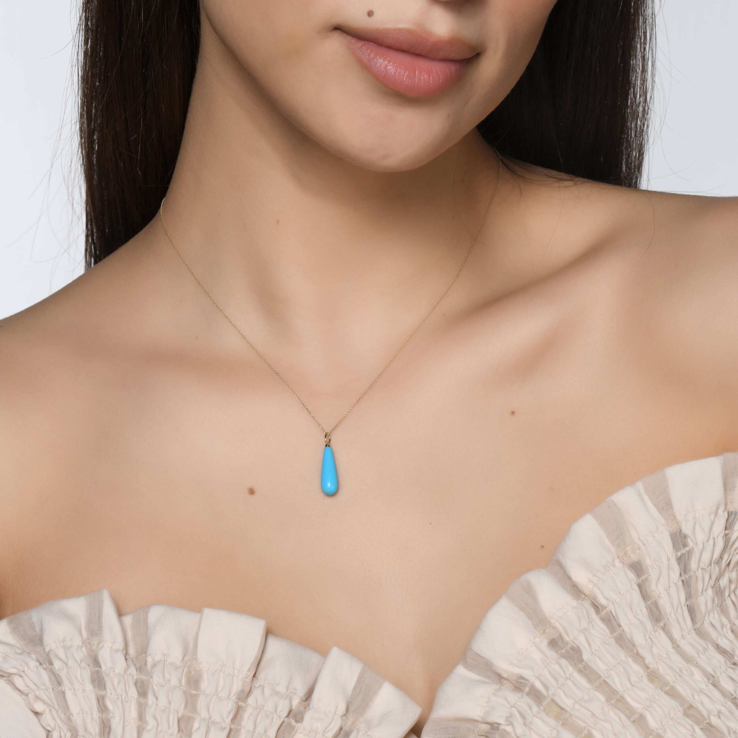 14 ayar Cabaret Turkuaz Damla Taşlı Altın Kolye, 43+2 cm uzunluk ile zarif ve şık bir kullanım sunar. Hipoalerjenik ve güvenli üretim.