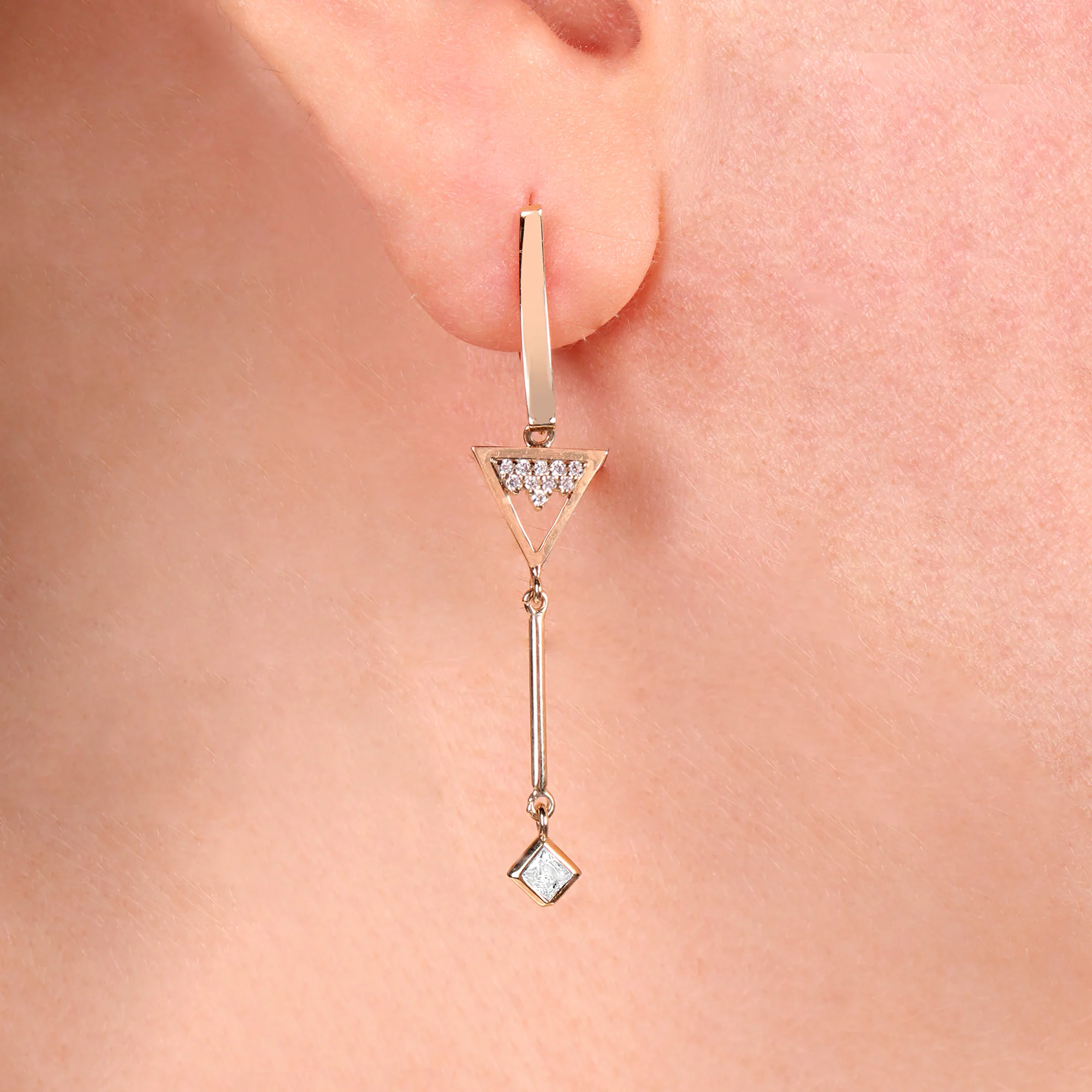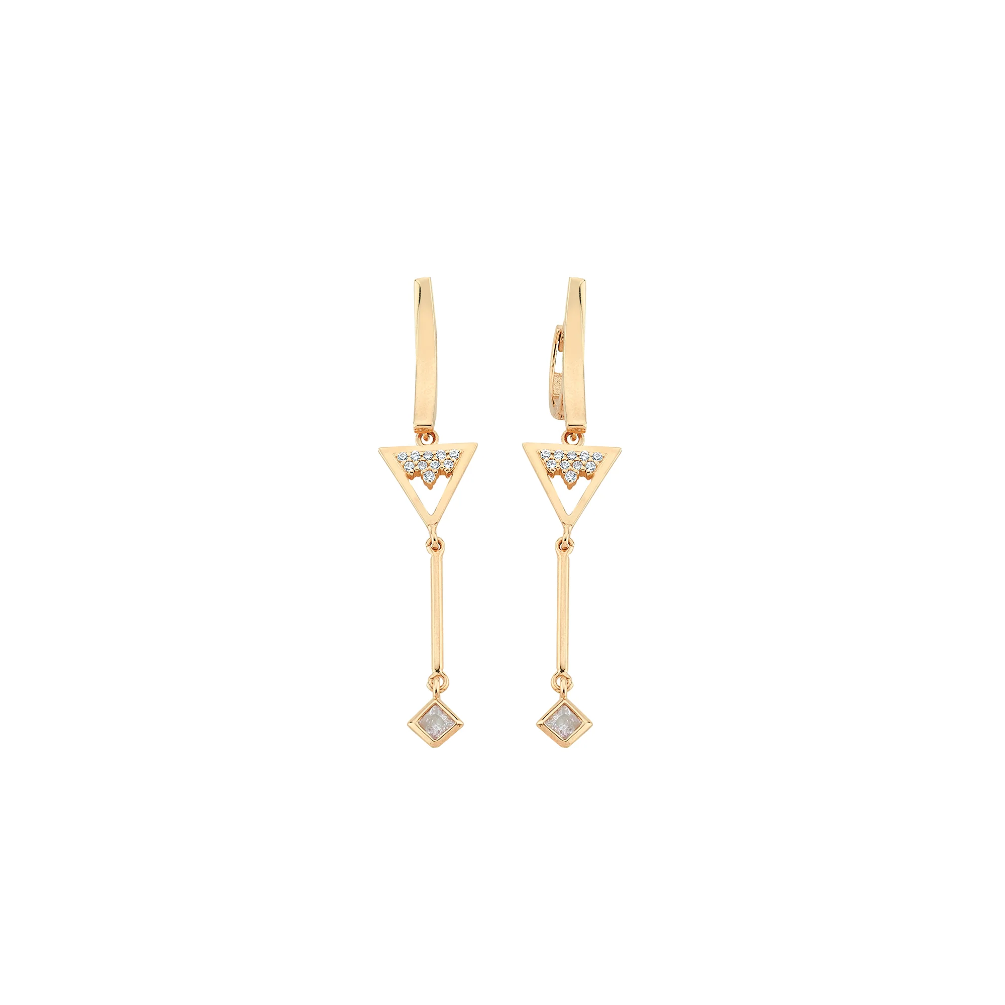 Karo Taş Sallantılı Üçgen Altın Küpe, 14 ayar altından zarafetle üretilmiştir. Üçgen formu ve kare kesim AAA+ zirkon taşlarıyla modern bir görünüm sunar. Parlak taş detayları küpeye göz alıcı bir ışıltı kazandırırken, hafif yapısı sayesinde günlük kullanımdan özel davetlere kadar konforlu bir şekilde takılabilir. Sarı, Rose ve Beyaz altın renk seçenekleriyle her stile uyum sağlar.