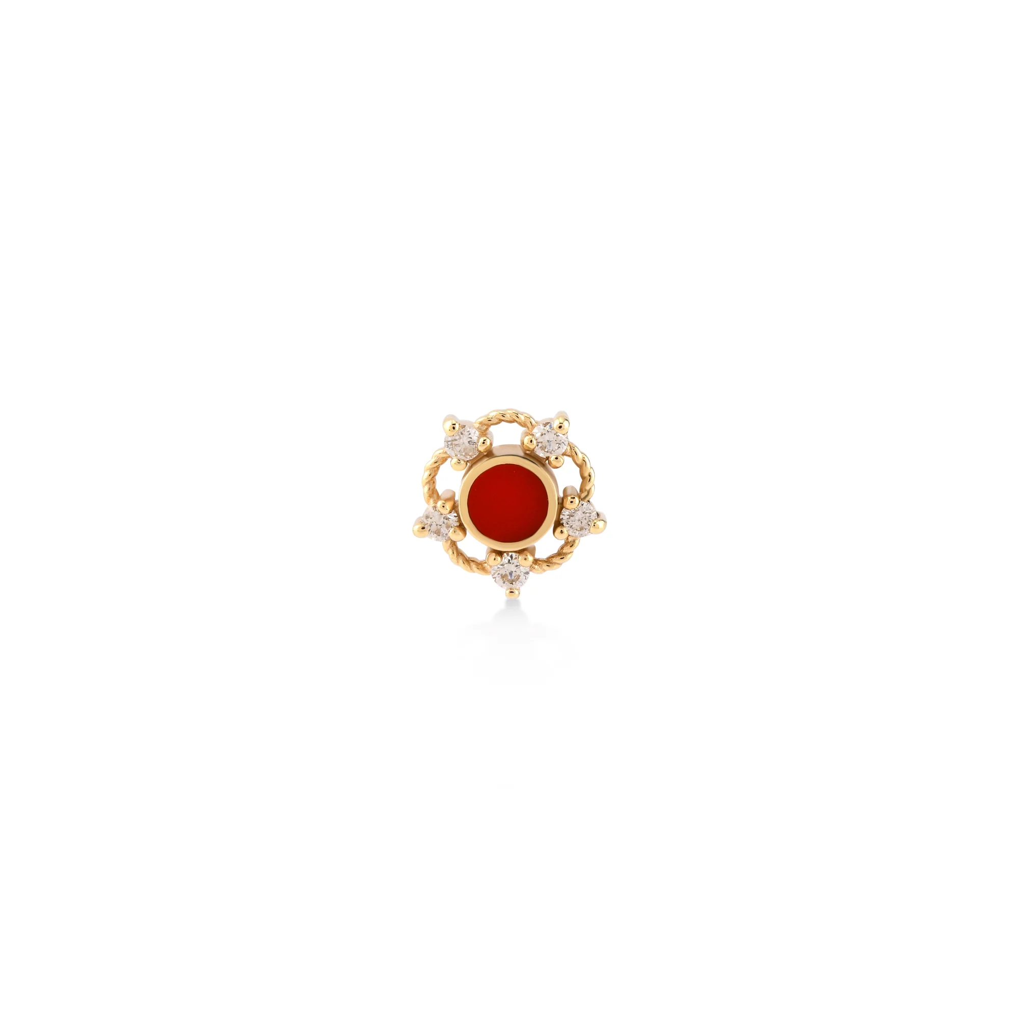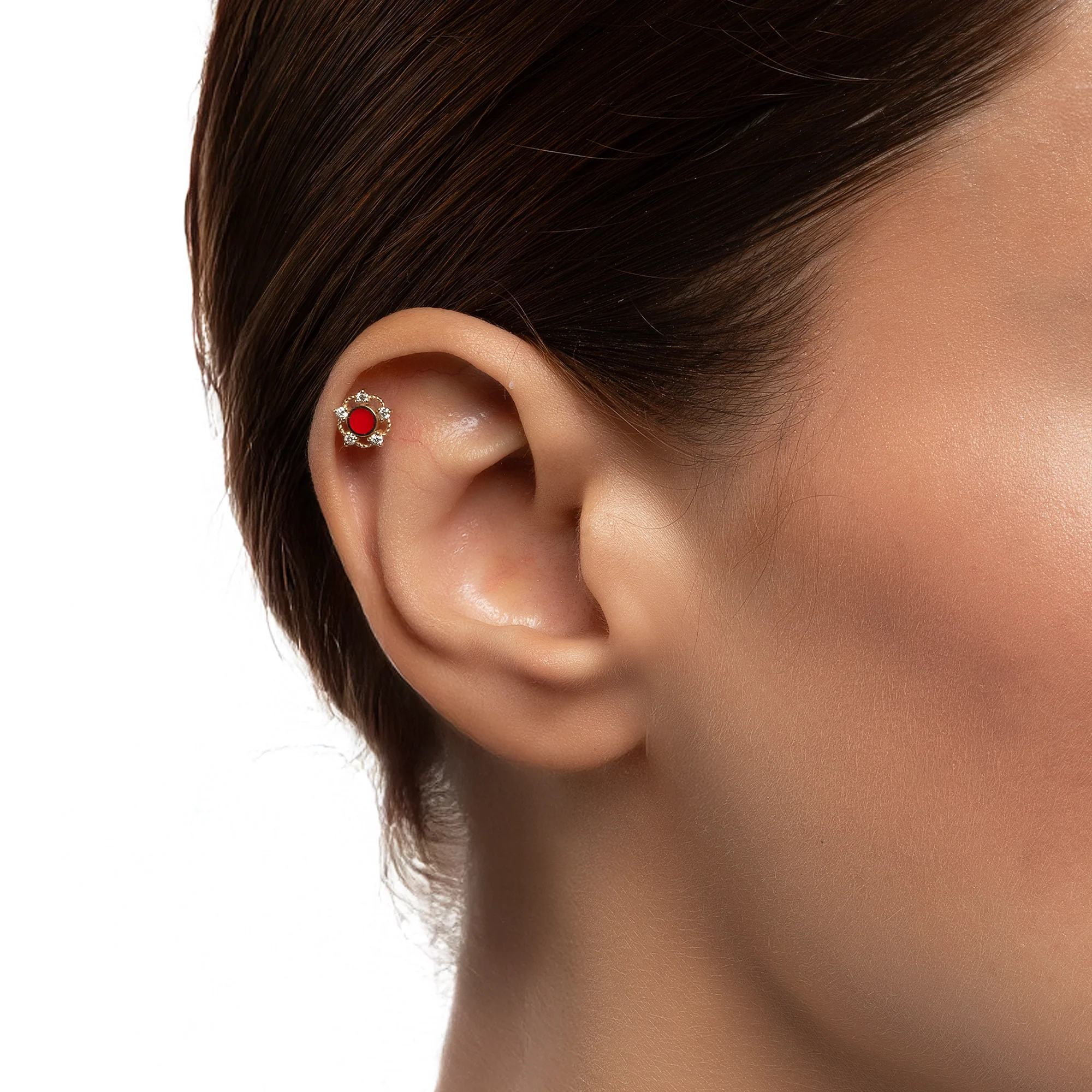 14 ayar Kırmızı Mineli Beş Köşe Pırlanta Piercing, 0,06 CT pırlanta ve kırmızı mine detayı ile zarif ve şık bir kullanım sunar. Hipoalerjenik ve güvenli üretim.