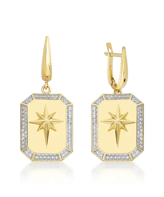 İkra Kuyumculuk koleksiyonuna ait bu Kuzey Yıldızı Altın Taşlı Küpe, yol gösteren kutup yıldızı figürünün mistik havasını 14 ayar altın kalitesiyle buluşturur. 7.18 gram ağırlığındaki belirgin ve dolgun yapısı, kulaklarınızda ışıltılı bir duruş sergilerken yüksek işçiliğiyle ön plana çıkar.