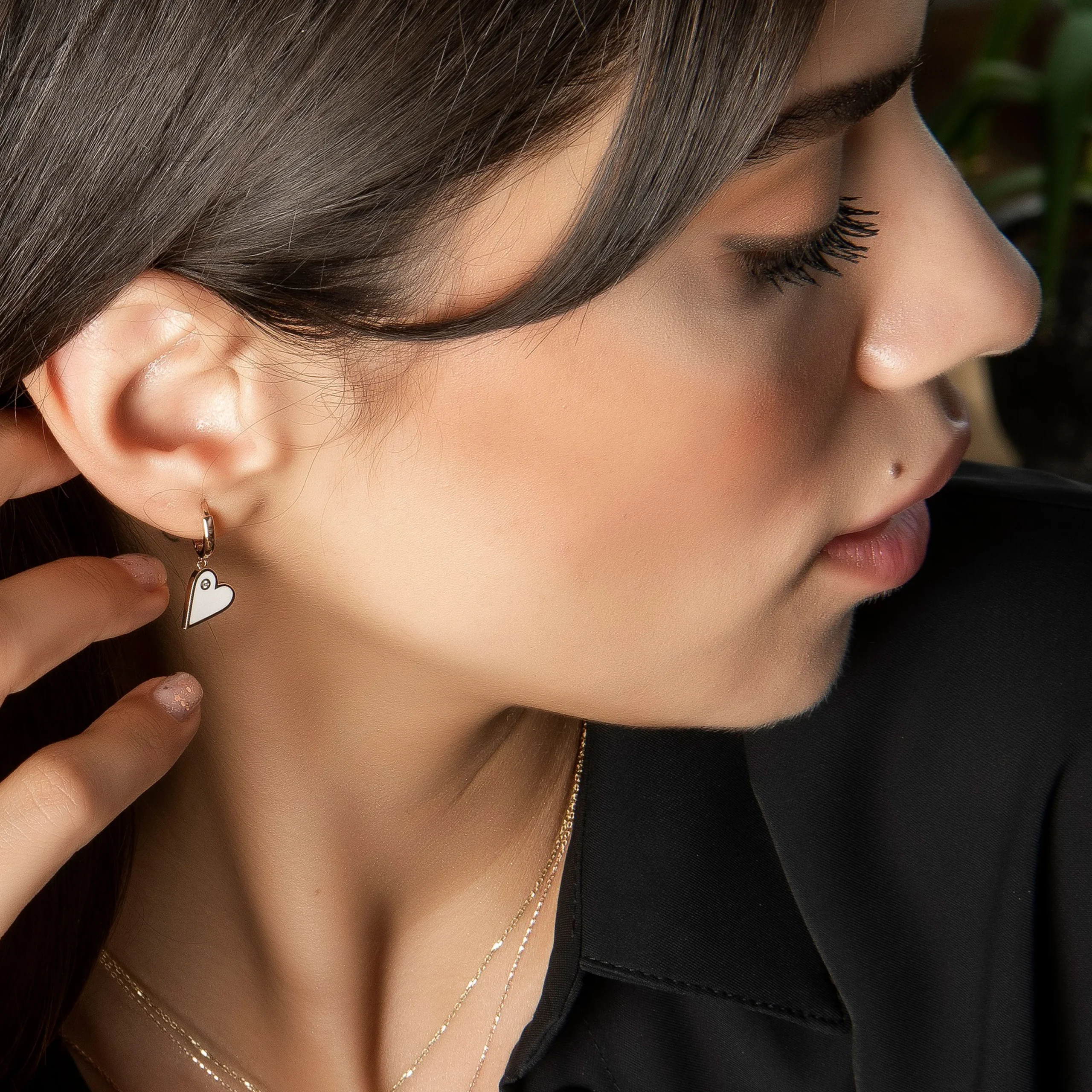 Mineli Kalpli Pırlanta Küpe, 14 ayar altının zarifliğiyle tasarlanmış, romantik ve şık bir aksesuardır. Siyah ve beyaz mineli kalp detayları, küpeye göz alıcı bir kontrast kazandırırken, ortasındaki pırlanta taşı ışıltısıyla stilinizi tamamlar. Hem günlük kombinlerde hem de özel günlerde öne çıkan bu küpe, zarafet ve modernliği bir arada sunar.
