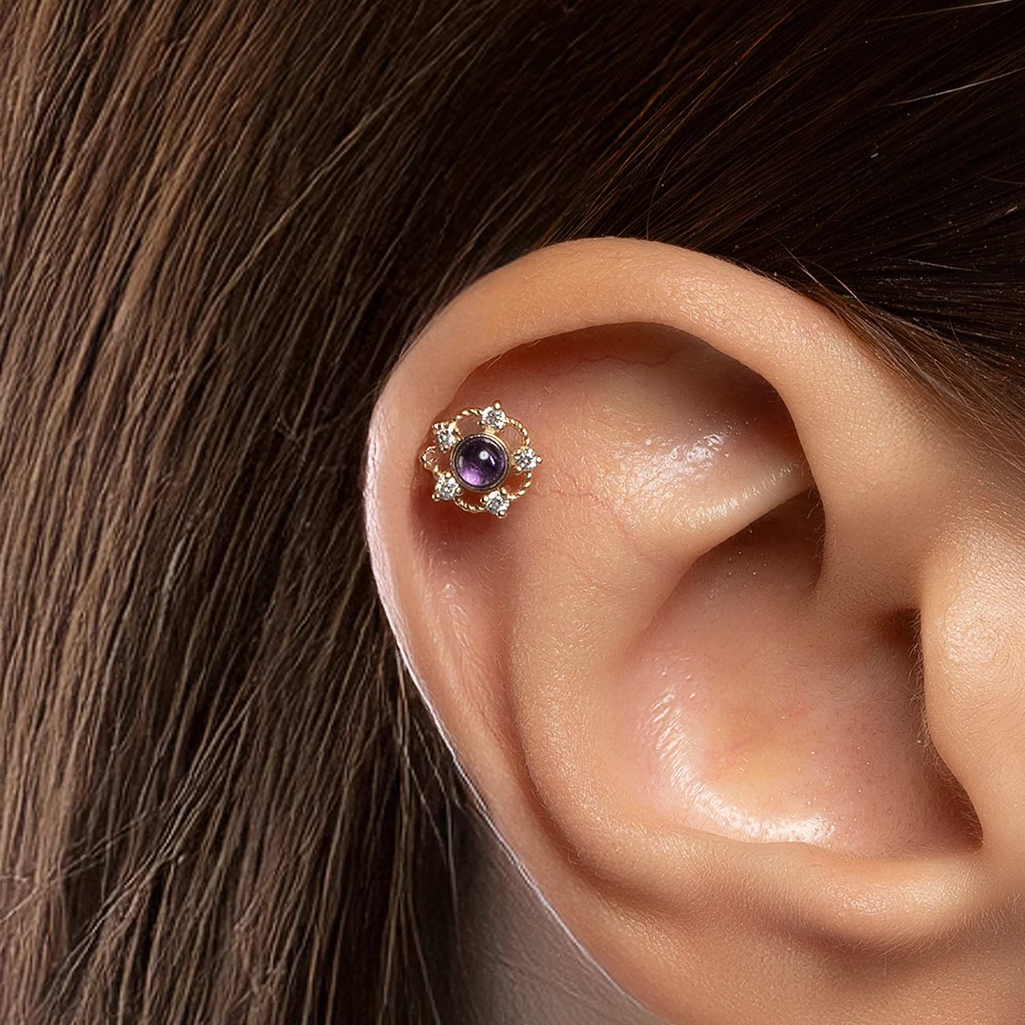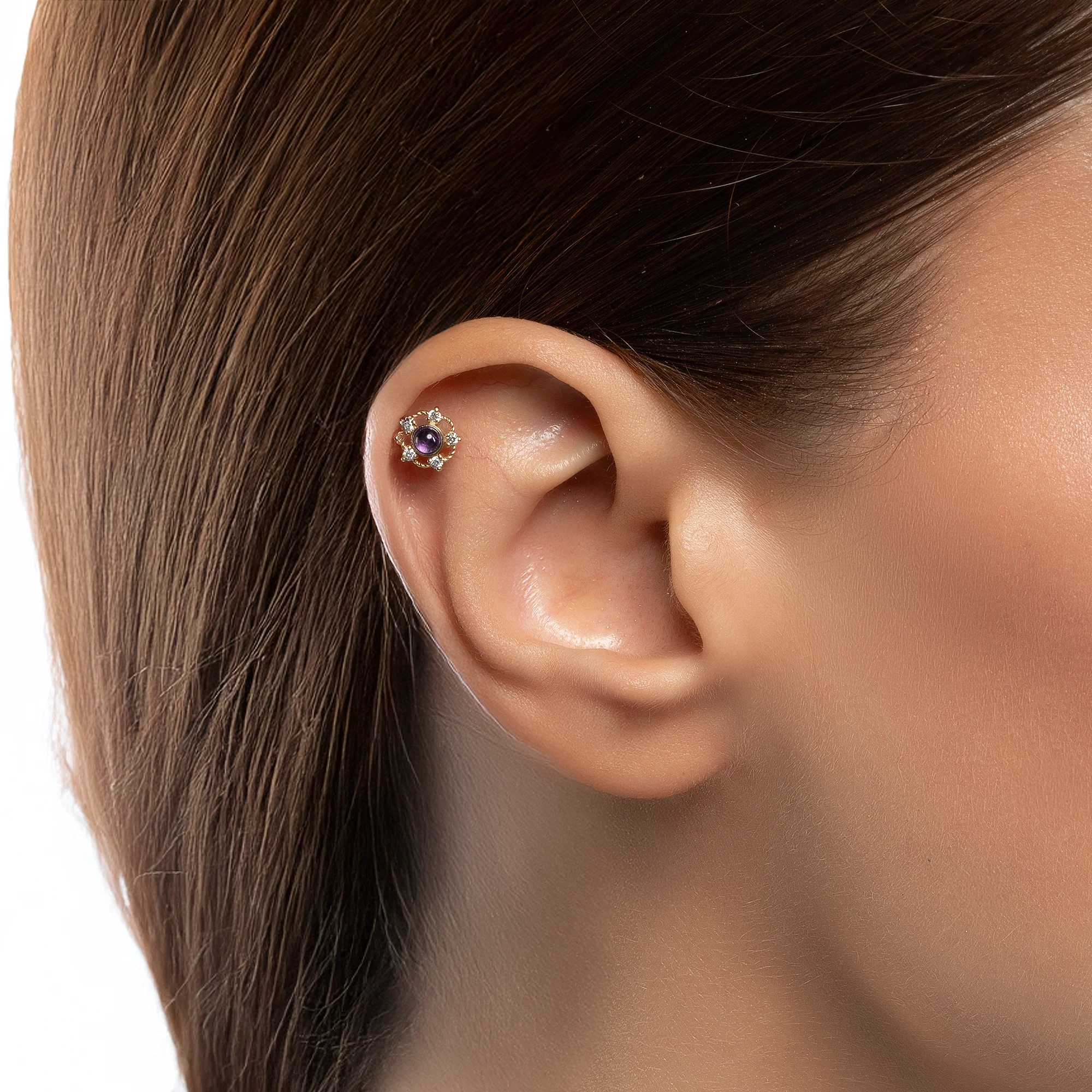 14 ayar altının zarif parlaklığıyla tasarlanan Turmalin Taş Detaylı Beş Köşe Pırlanta Piercing, modern beş köşe formu ve göz alıcı mor turmalin detayıyla kulağa sofistike ve dikkat çekici bir dokunuş katar. Ürün, 5 adet 0,06 CT pırlanta ve 1 adet 0,13 CT mor turmalin taşı içerir. Fiyat ve karat bilgileri tek bir piercing için geçerlidir. Günlük kullanımda zarif bir aksesuar, özel günlerde ise öne çıkan bir detay olarak öne çıkar.