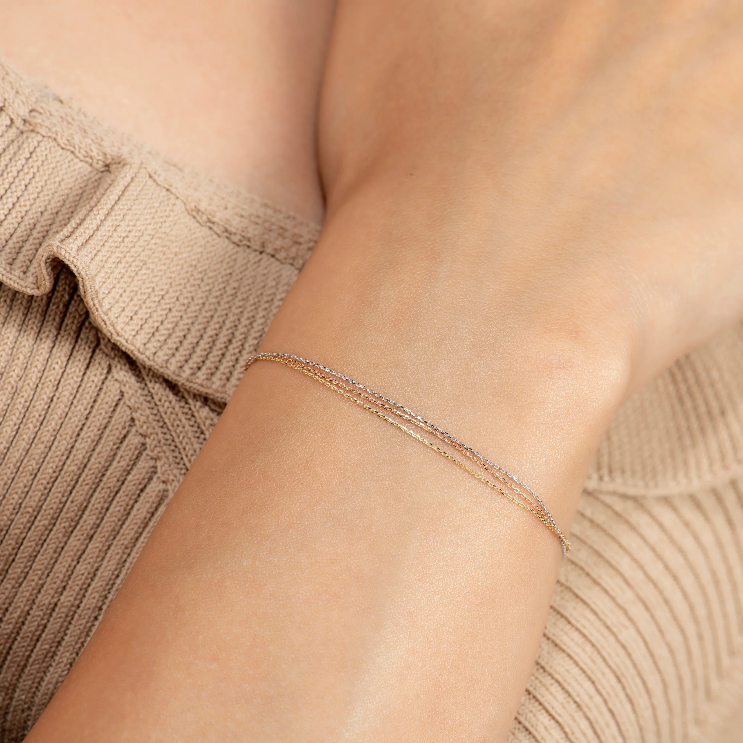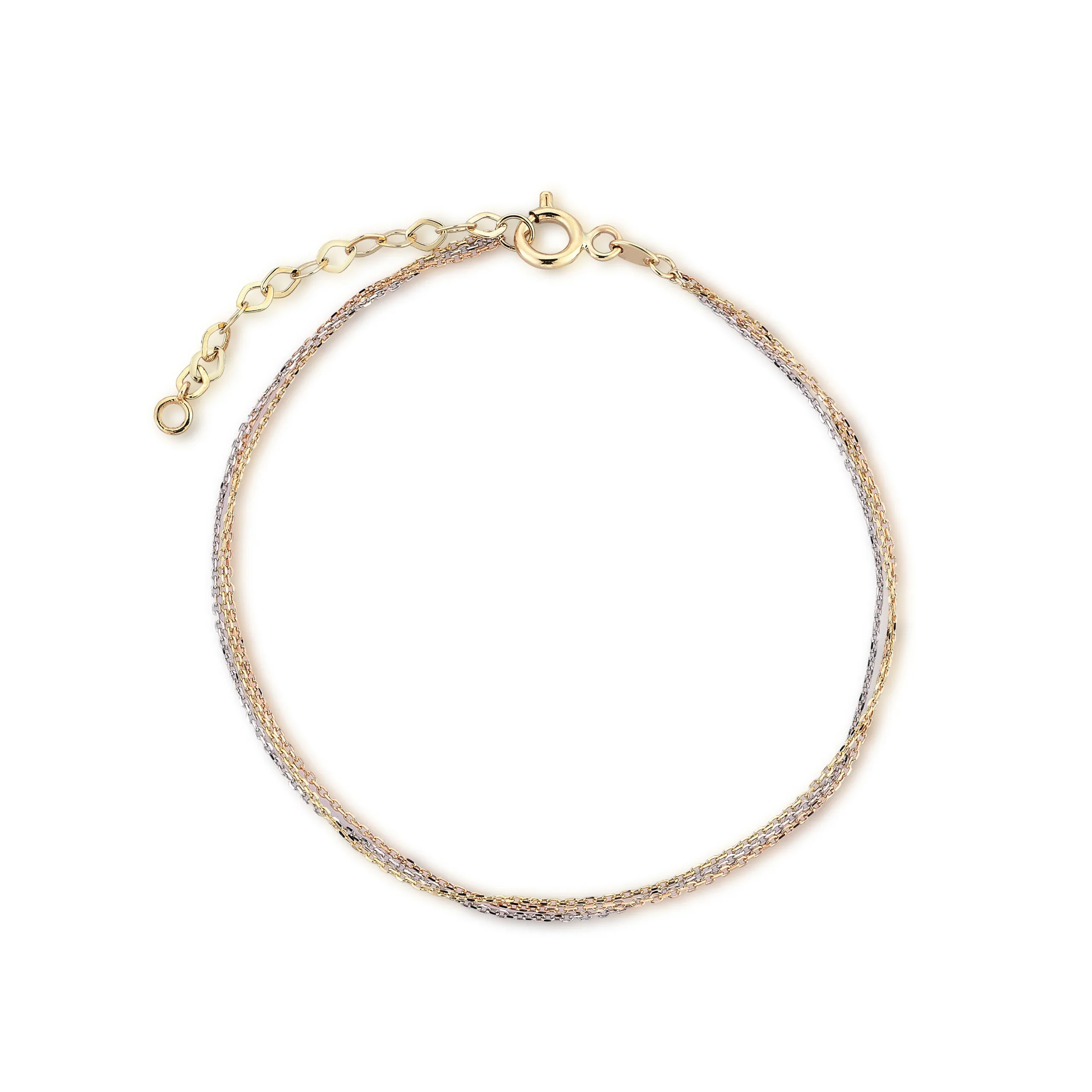 14 Ayar Altın Üç Renk Zincir Bileklik, 1,20 gr ağırlığında olup 16,5 cm uzunluk + 2 cm uzatma payına sahiptir. Modern üç renkli zincir tasarımıyla; sarı, rose ve beyaz altın seçenekleriyle üretilmiştir.