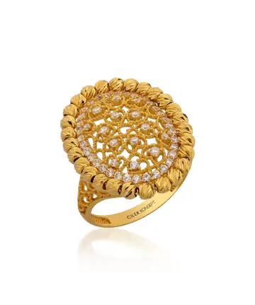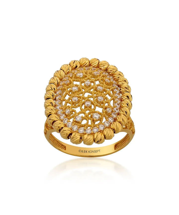 İkra Kuyumculuk koleksiyonunun modern ve göz alıcı tasarımlarından biri olan bu Yadigar Altın Dorikalı Yüzük, 14 ayar altının kalitesini ışıltılı bir estetikle sunuyor. Tasarımın merkezinde ve çevresinde yer alan ikonik Dorika topları, yüzüğe sadece hareket katmakla kalmıyor, aynı zamanda her ışık açısında pırlanta etkisi yaratan bir parıltı sağlıyor.